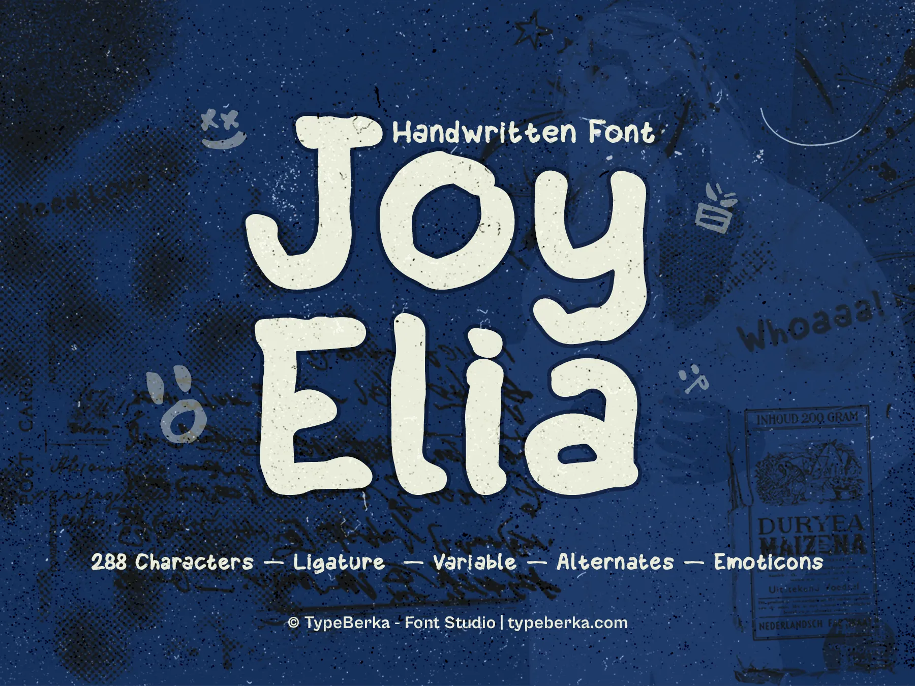 Joy Elia includes special ligatures that automatically generate emoticon-style glyphs using simple character combinations. These playful details help your designs feel more engaging, expressive, and memorable—without breaking visual consistency.