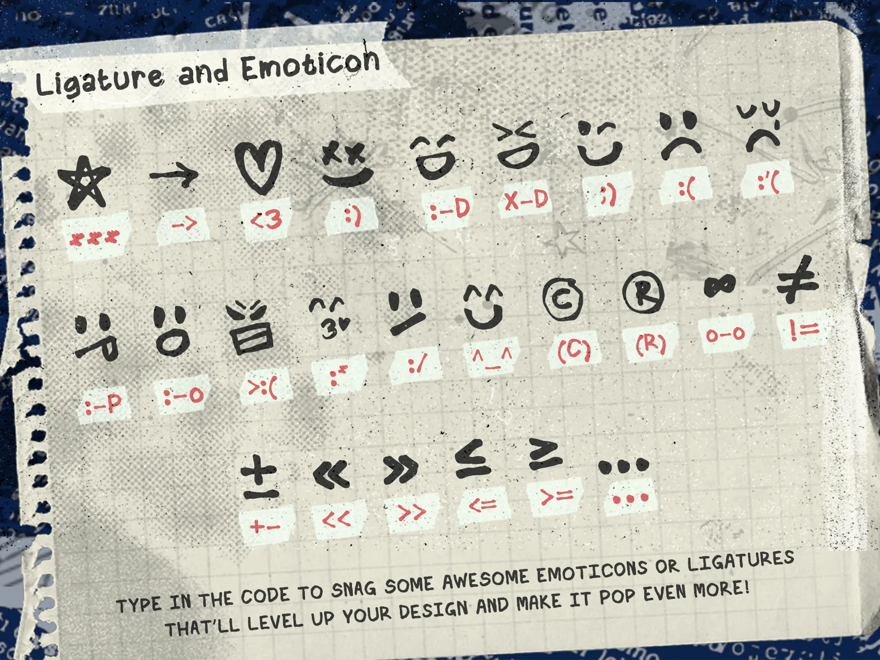 What makes Joy Elia stand out is its unique ligature system that transforms character combinations into emoticons. Simple inputs like symbols and letters can trigger expressive faces, adding personality and fun to your designs without extra graphics.