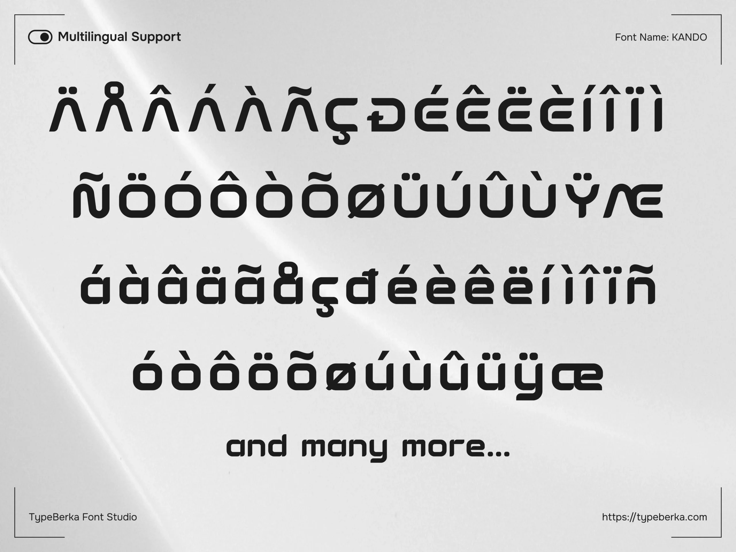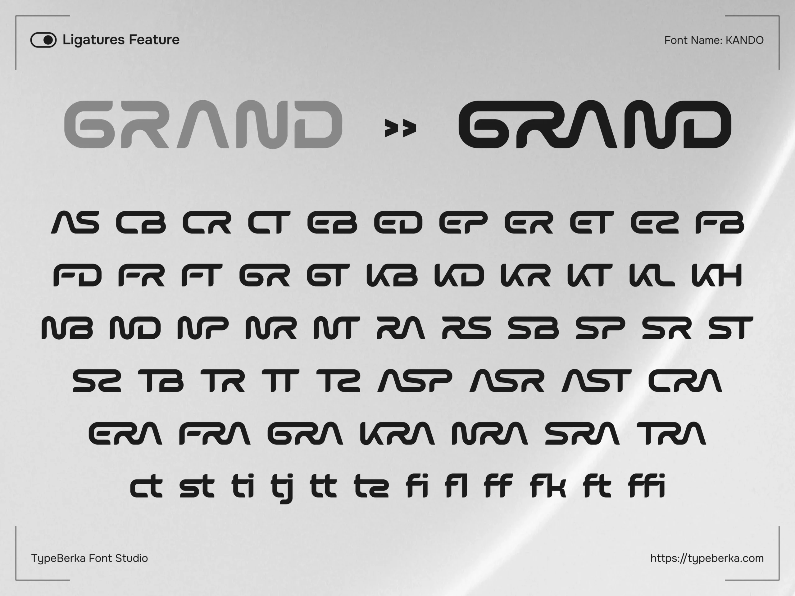Kando includes a ligature set that tightens common letter pairs into cleaner connections, which helps when you build compact wordmarks or all-caps headers. The diacritics are proportionally aligned, so extended Latin text keeps a consistent cap line and accent spacing across languages. If you rely on OpenType behavior in design apps or web layouts, Kando’s feature set follows the same model described in the OpenType overview