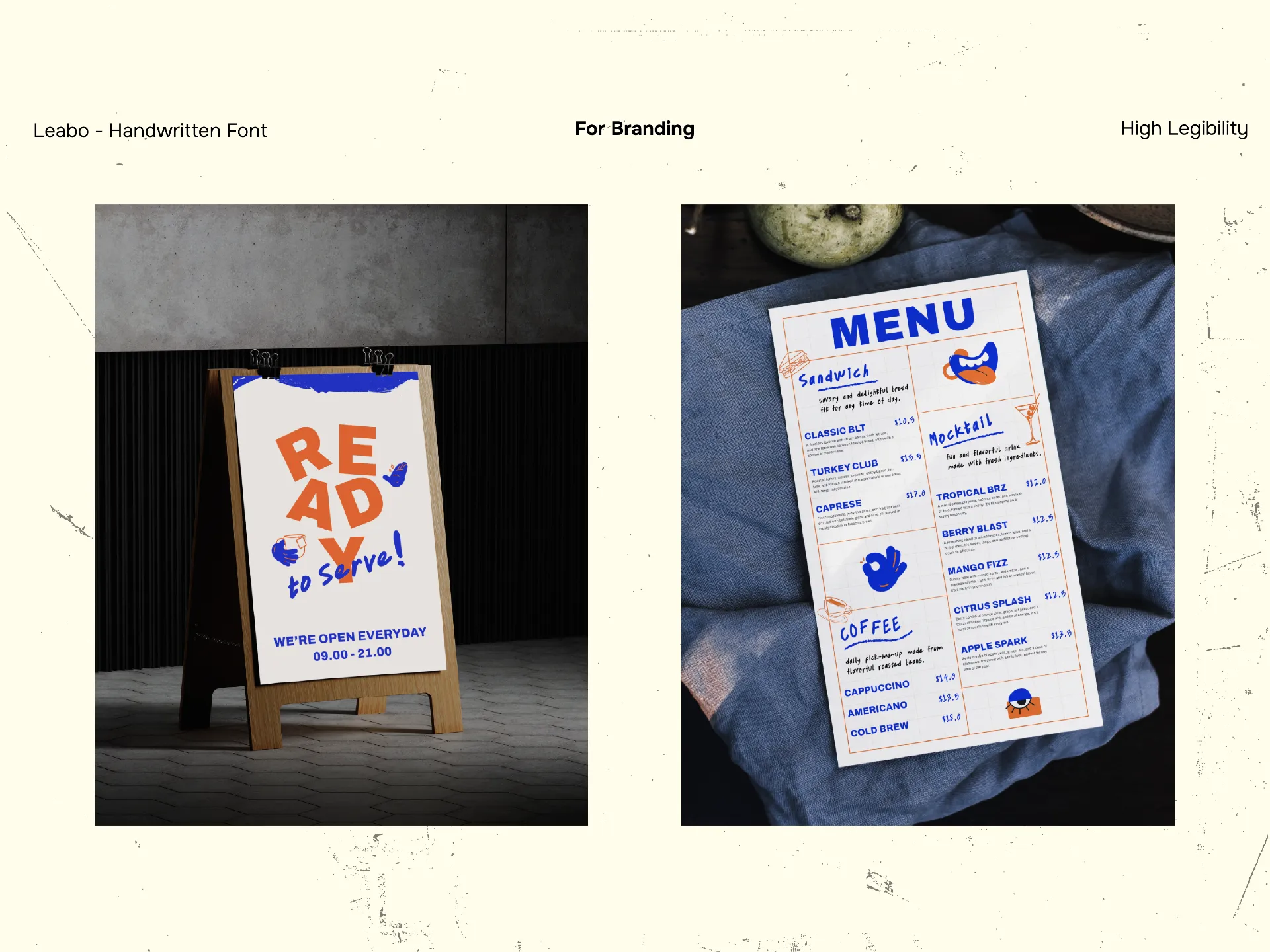 Leabo is a clean and friendly handwritten font with high legibility. Perfect for branding, packaging, posters, menus, social media, and editorial designs. Includes full characters with professional readability.