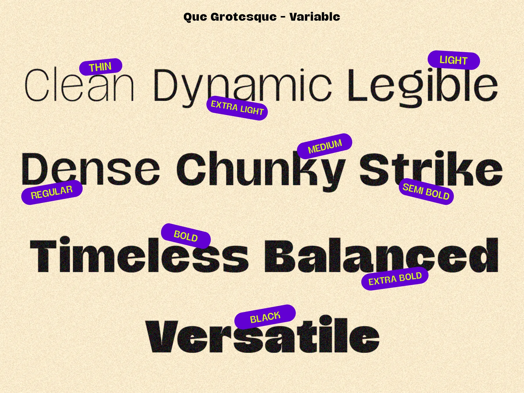 Que Grotesque is a modern grotesque typeface designed for clarity, flexibility, and timeless appeal. Featuring a full variable weight range from Thin to Black, rich alternates, and multilingual support, it’s built for refined branding, editorial systems, and contemporary digital design.
